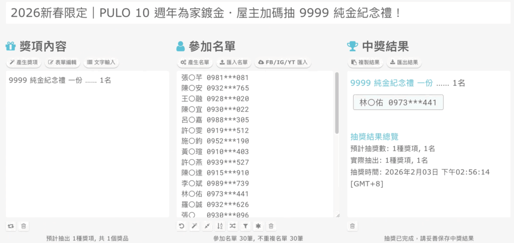 - 純金好禮中獎公佈:2026/02/03 (二) 於官方粉絲專頁公告