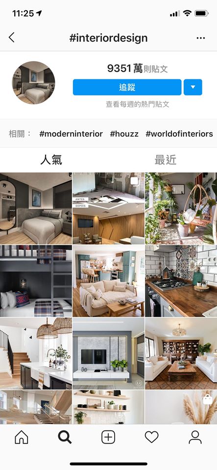 只要在搜尋列打到 interiordesign,就會有9千多萬的照片出現在你面前,我覺得能看到萬分之一的照片,就是強人了。