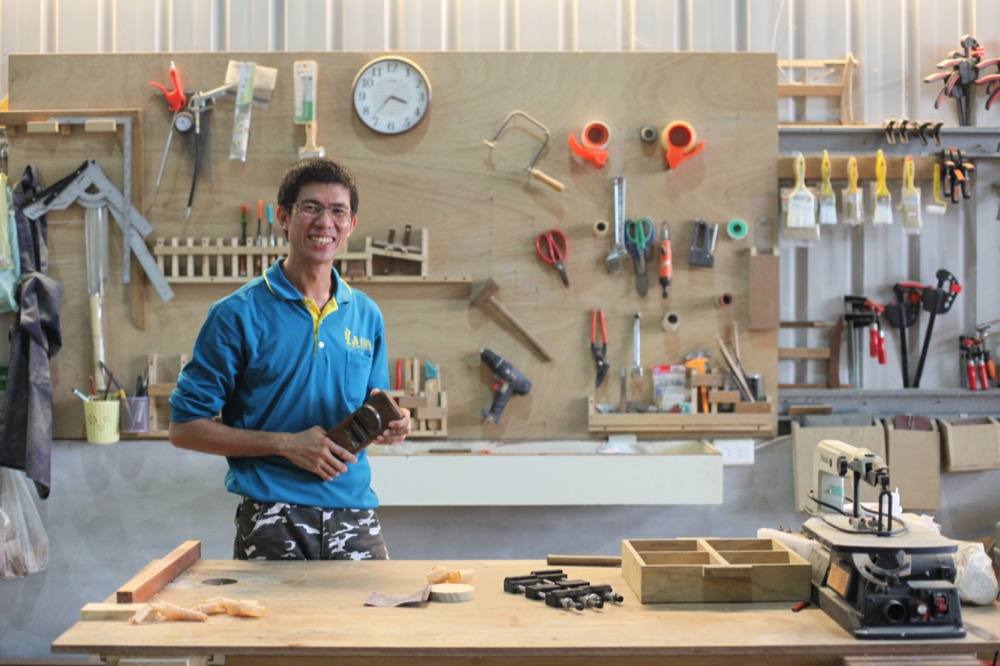 工作室的角落擺放著一個特製的小木屋,打開門一看,牆面上裝著液晶電視,地板上散落著玩具,一角還有兩張小木椅。原來這是光薰要做給父母露營用的露營車廂,採組合式設計,外開兩窗,裡面還有抽風機、燈、插座、WIFI。他構想了三個月,以日杉作為主體,施作了一個月才完工。可以加裝在貨卡後車廂上,載到露營區也很方便。本想給父母驚喜,沒想到父母還是習慣睡帳蓬。所以只好放在工作室變成孩子的遊戲室。光薰的孝心,就是希望父母能夠早日退休享清福,現在也夢想存錢買一台真的露營車,載全家環島出遊。